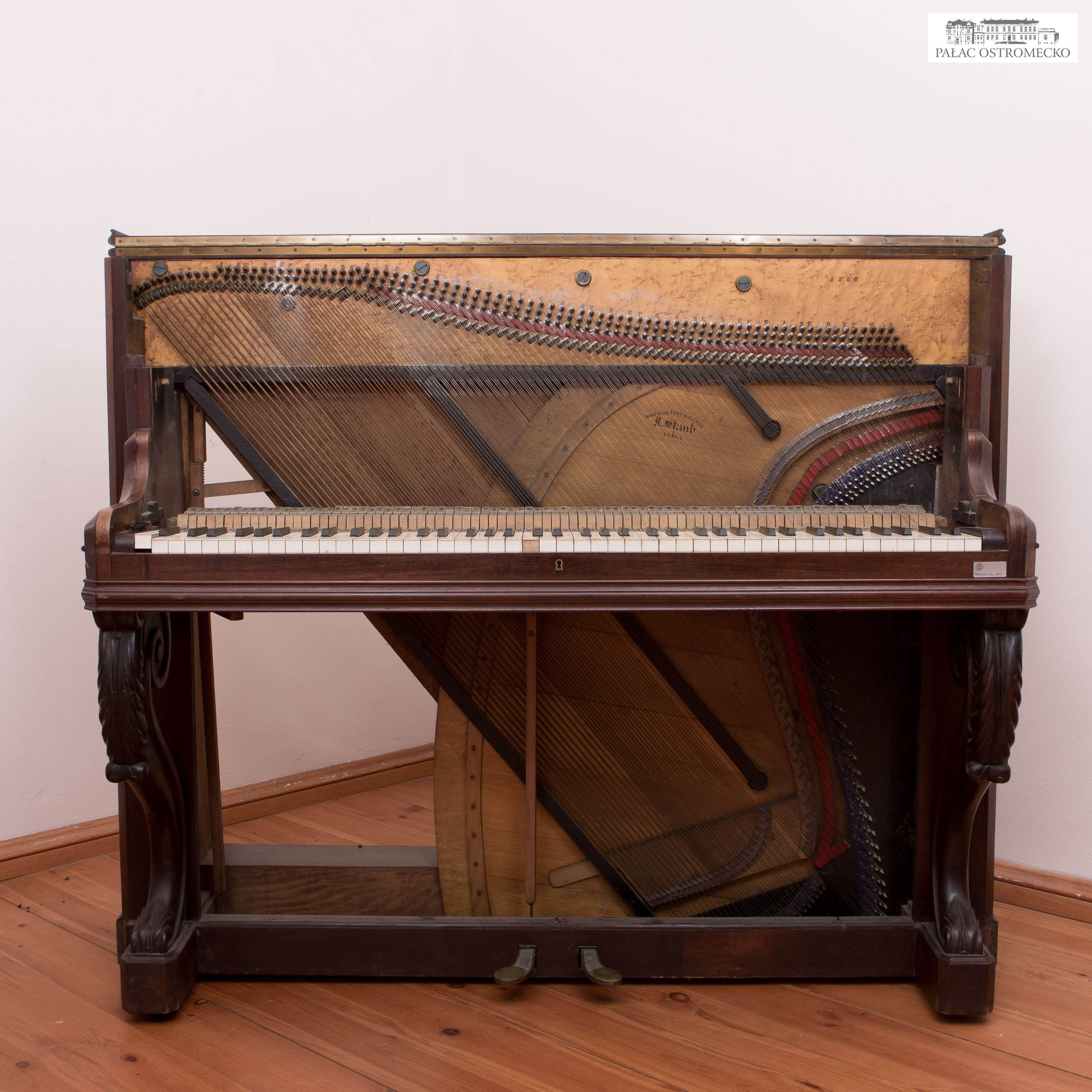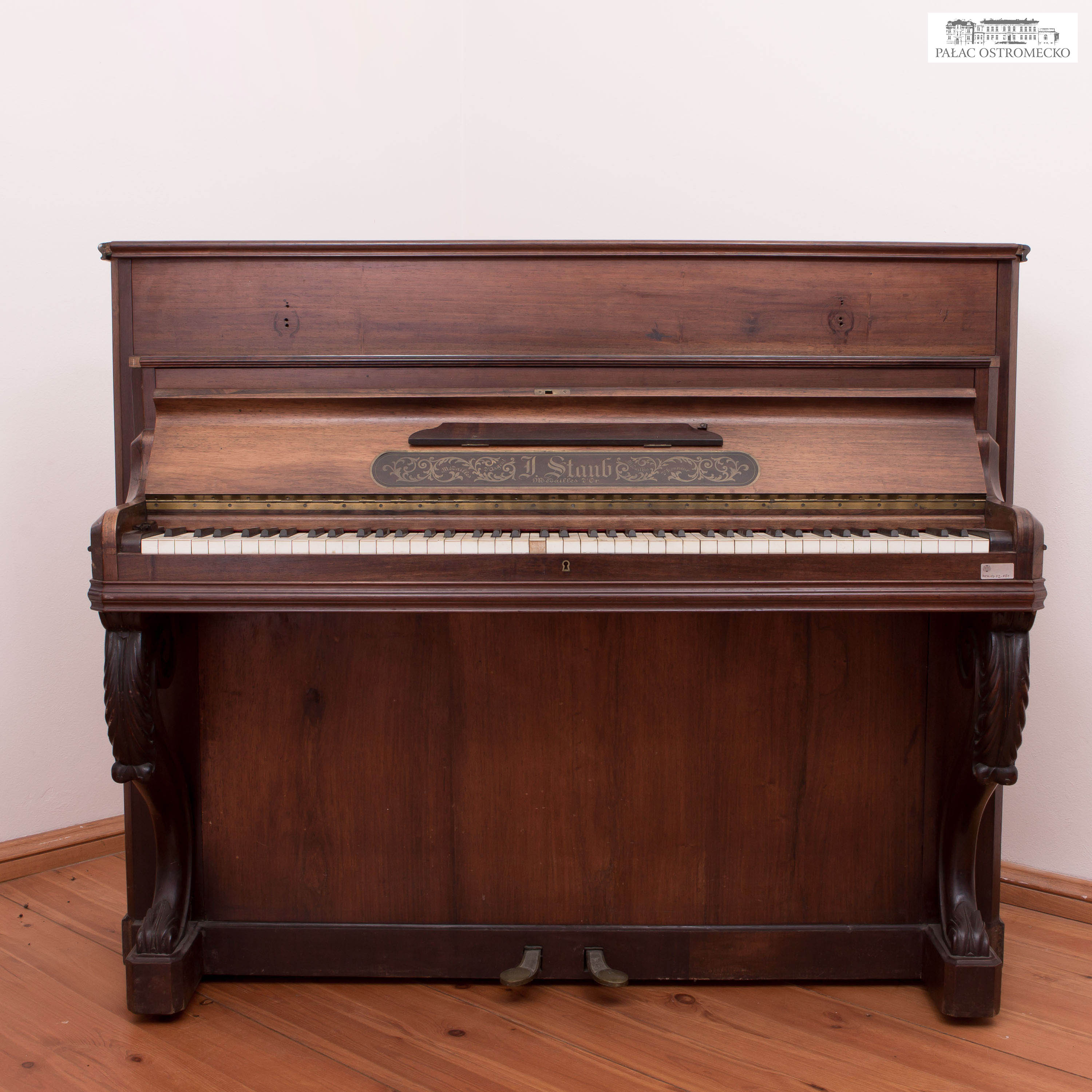 Inscriptions: on the keyboard cover, a square nameplate inlaid in brass with a floral decoration reads: Medailles d’Argent / J. Staub / Medailles d’Or / Medailles d’ Honneur; another inscription painted in black on the soundboard reads: MANUFACTURE de PIANOS / J. Staub / A / NANCY / 9197; A. Staub is penciled on the A2 key lever and POLMER is pressed