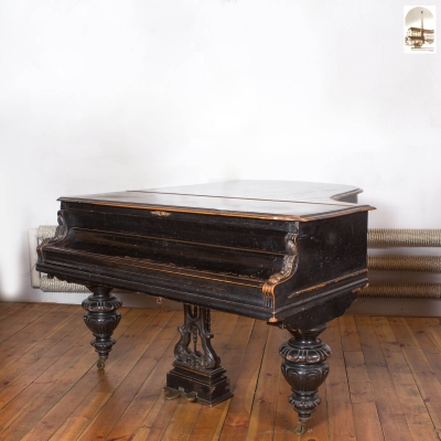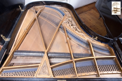 Description: black polished. Cross-, single-, double-, triple-strung; full frame casted together with a capotasto bar for all strings and hitch pin block armour. English double repetition action with overdampers
