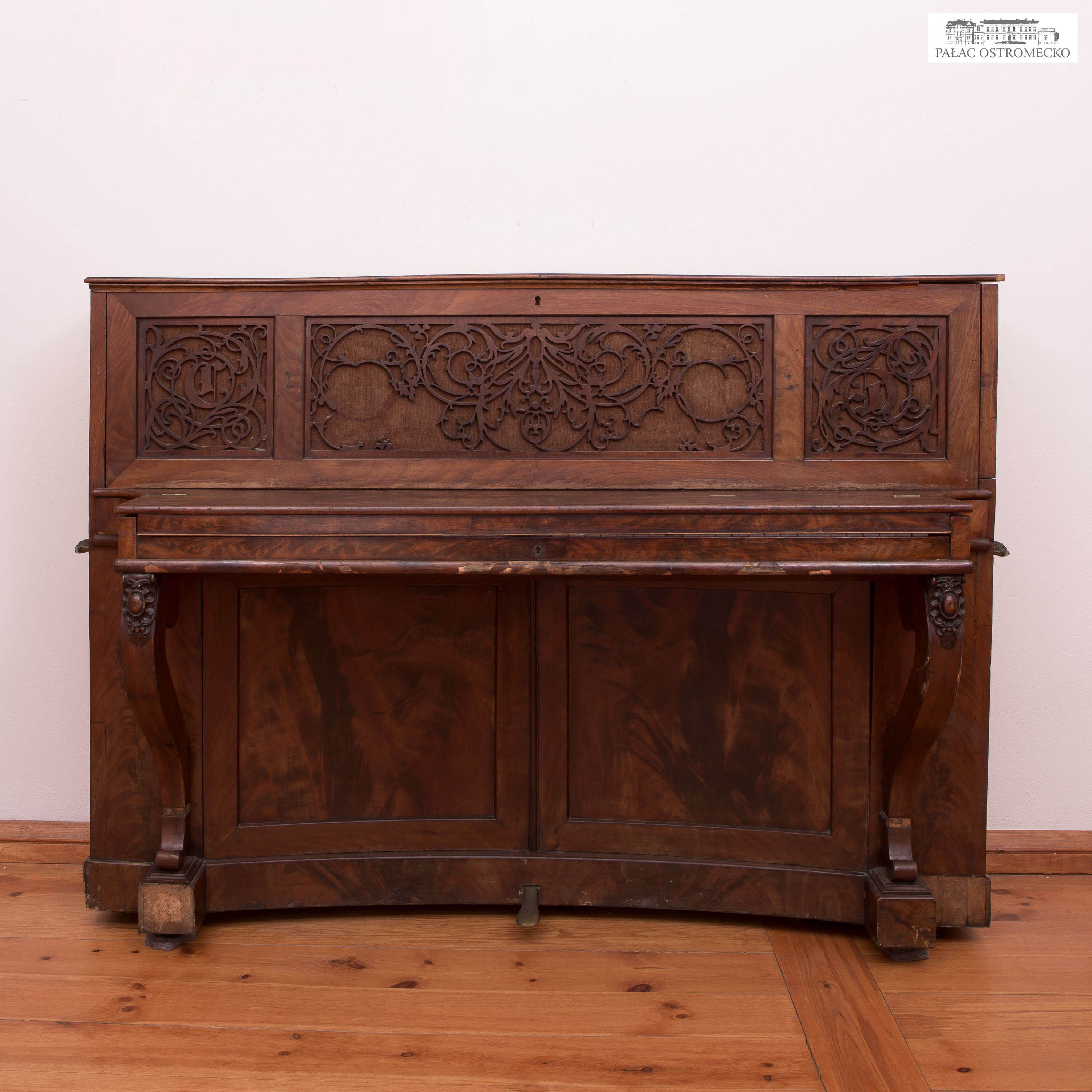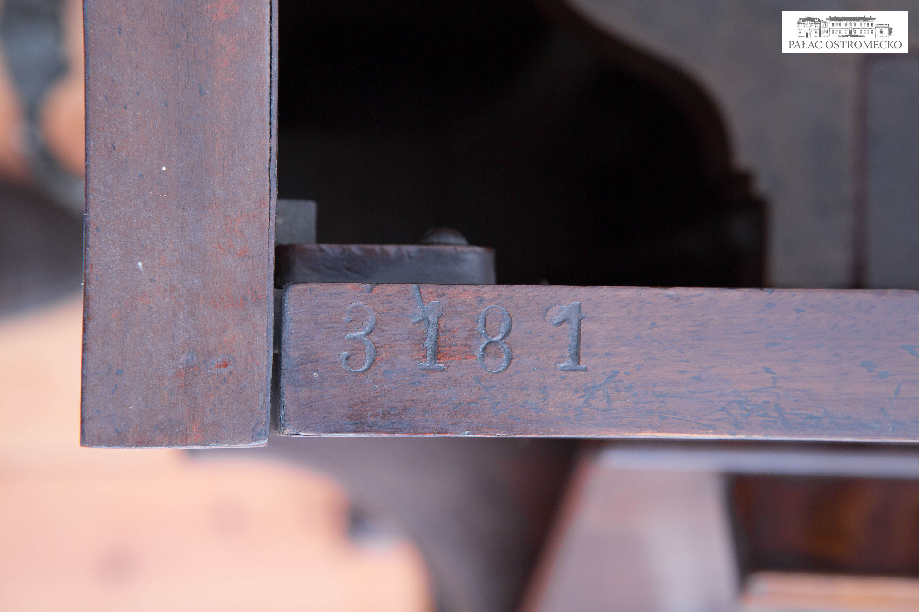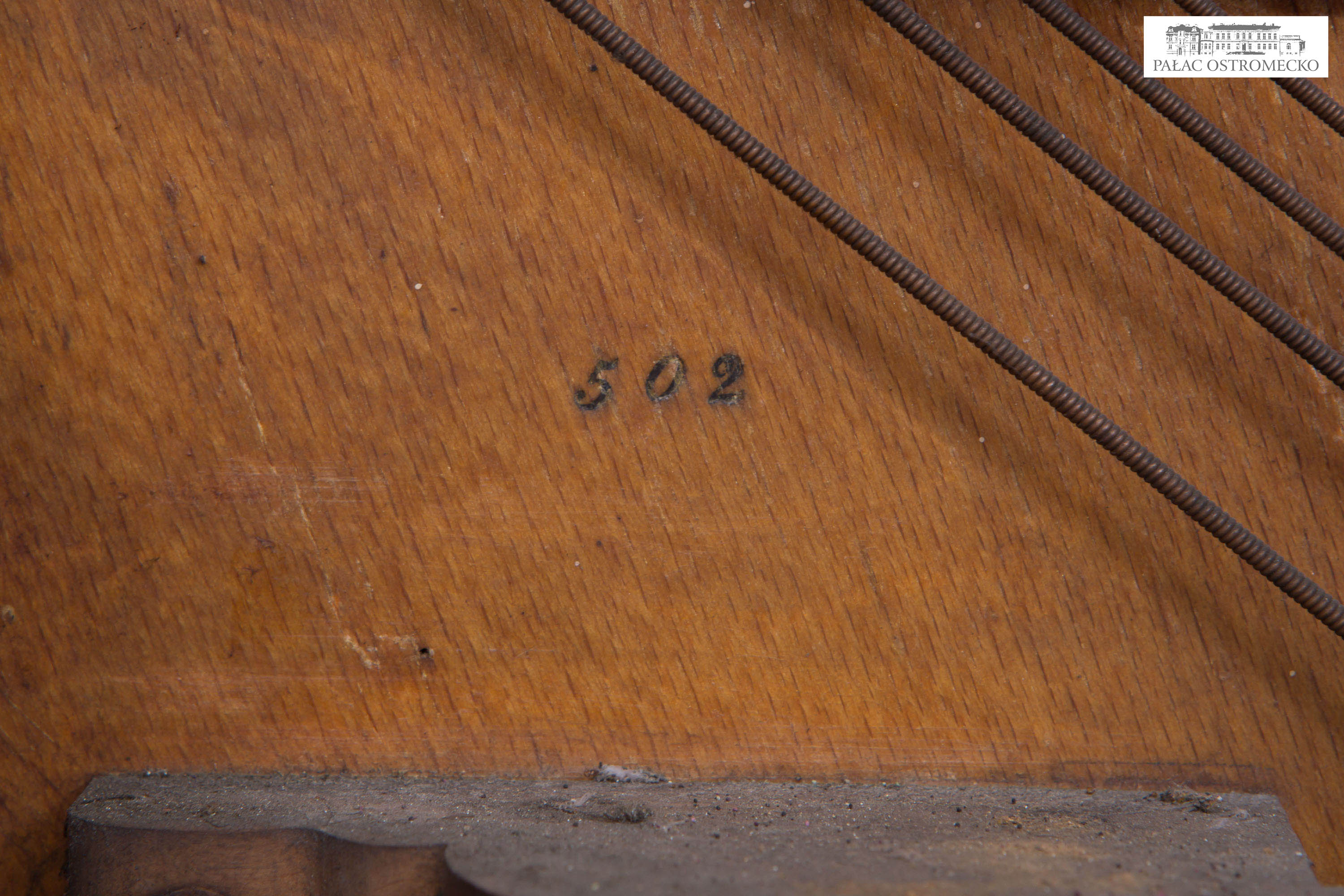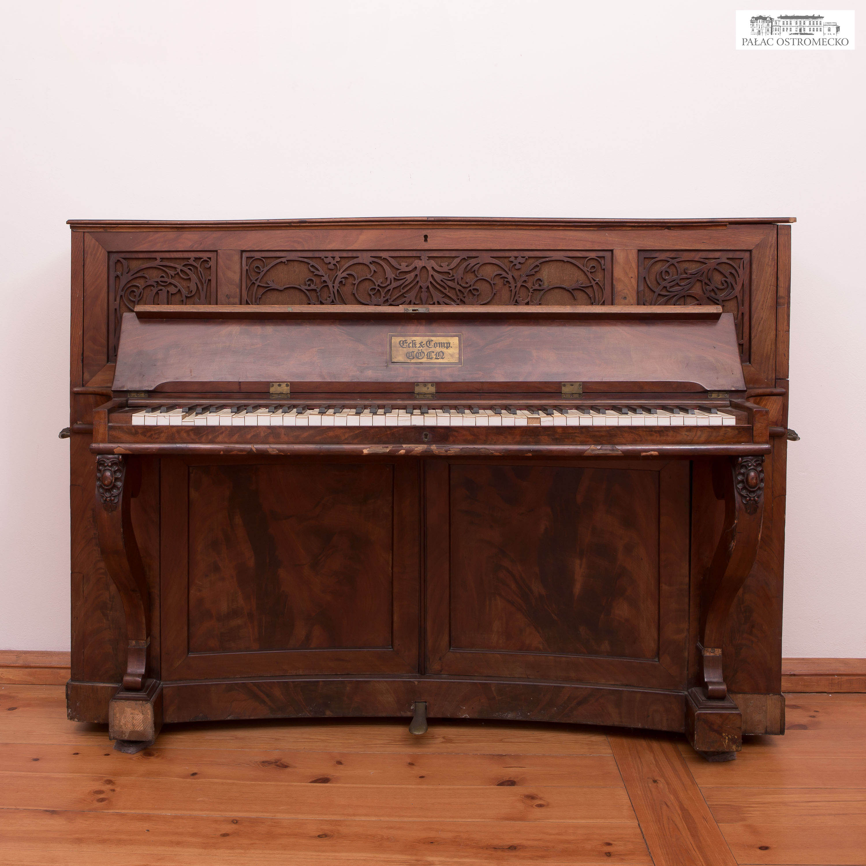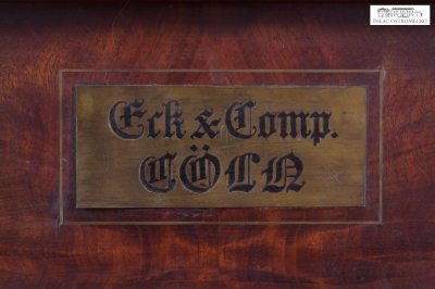 Inskrypcje: na pokrywie klawiatury inkrustowana mosiądzem prostokątna tabliczka firmowa: Eck & Comp. / CÖLN; na strojnicy wytłoczony numer: 502; na krawędzi drzwi górnych po lewej: 3181; pod stołem klawiaturowym wypalona eliptyczna pieczęć: W. Olbrich & Co. / Glatz; oraz zatarte cyfry i słowa; w ażur drzwi górnych wplecione inicjały: E C.