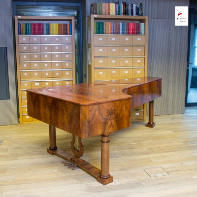 Opis: fornirowany orzechem piramidą, całość na nogach w kształcie toczonych kolumn. Prostostrunny, rama drewniana, 1 wspornik strojnicy, naciąg 1-2-3-strunny, mechanika wiedeńska, tłumiki klinowe